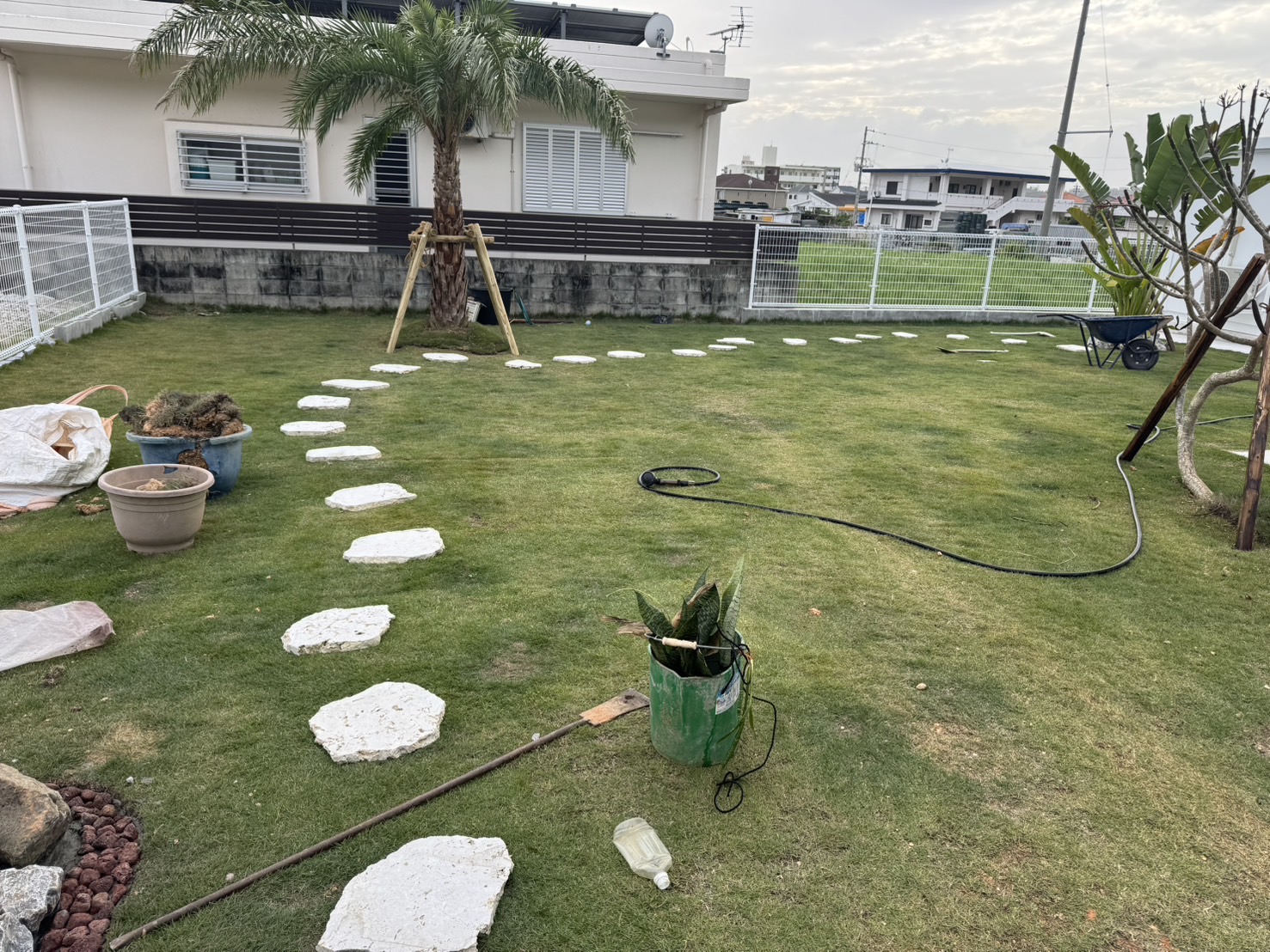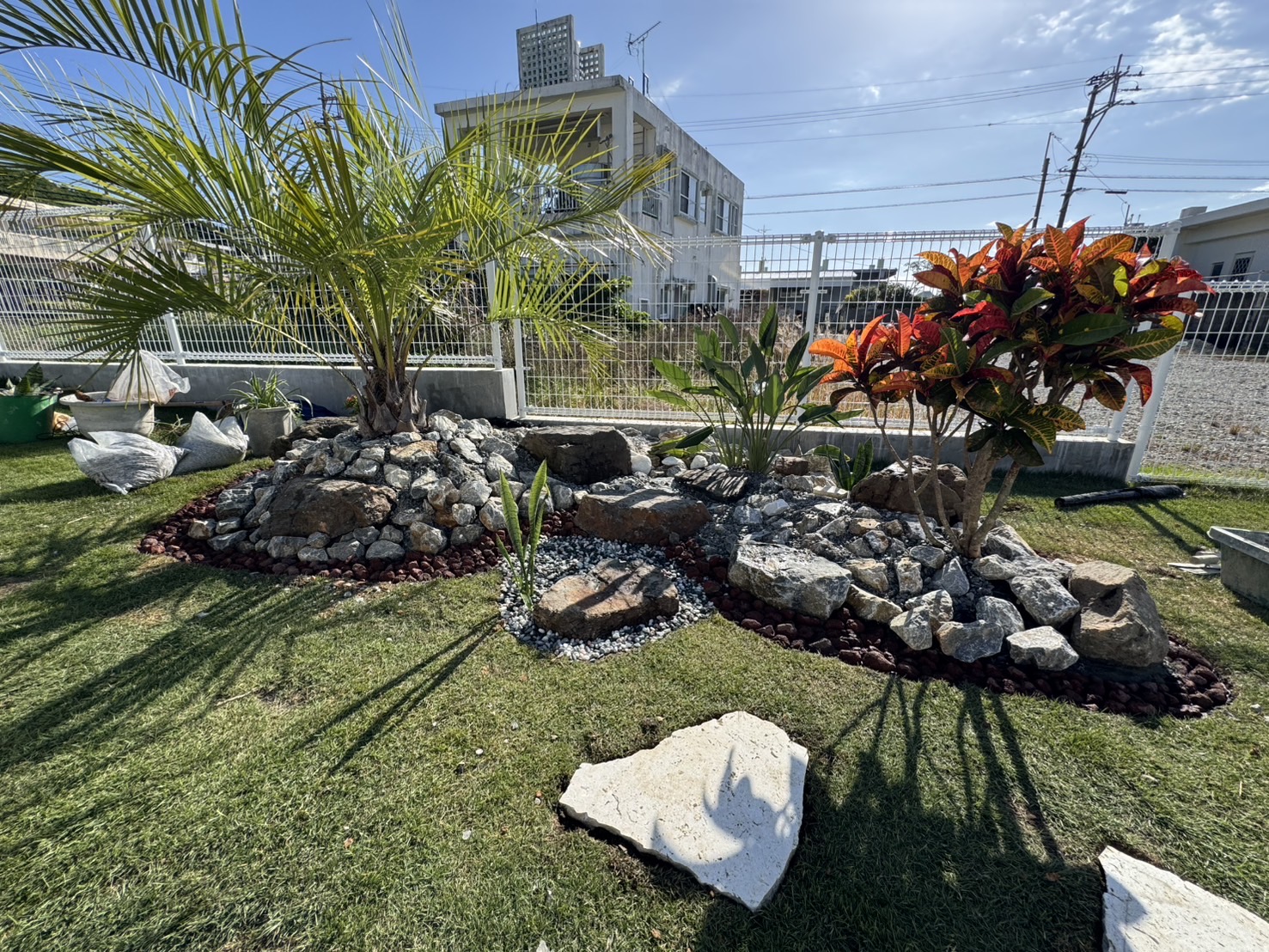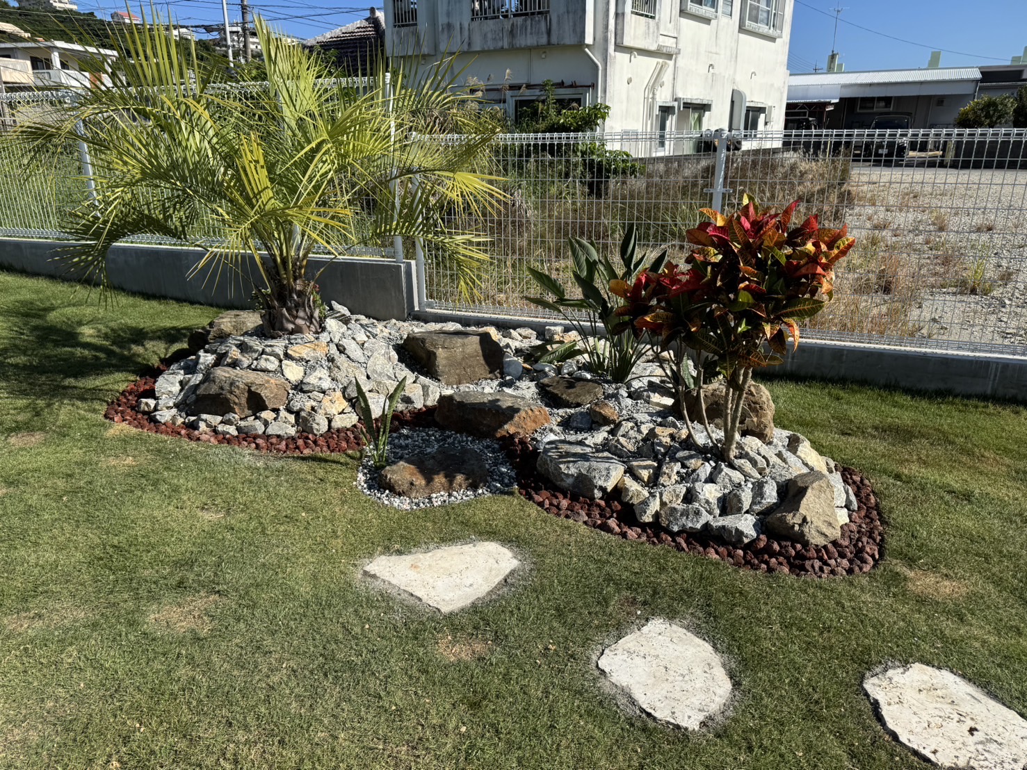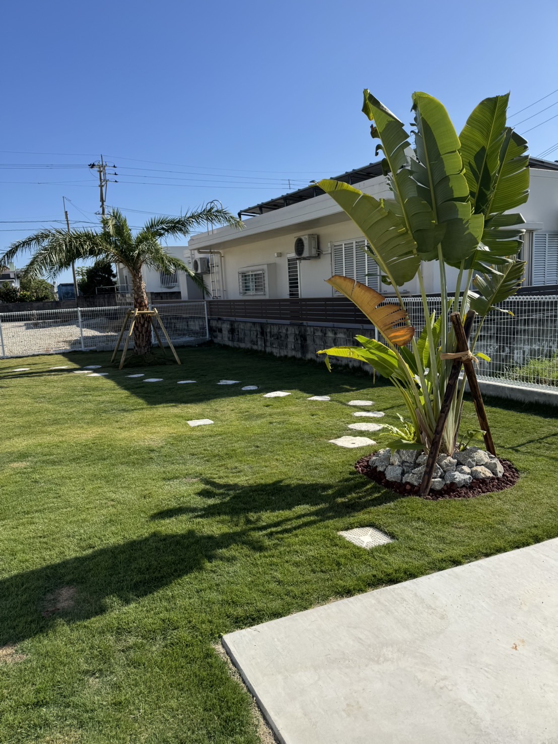 もともと広々とした庭でしたが、お客様がココスヤシ好きということで、ココスヤシを主役にしたドライガーデンへ🌿各ポイントにはナツメヤシとプルメリア、旅人の木を配置し、南国リゾート感を演出✨🌴足元には琉球石灰岩の踏み石を据え、自然な動線と表情をプラス。庭全体の印象がぐっと引き締まり、雰囲気が大きく変わりました😊