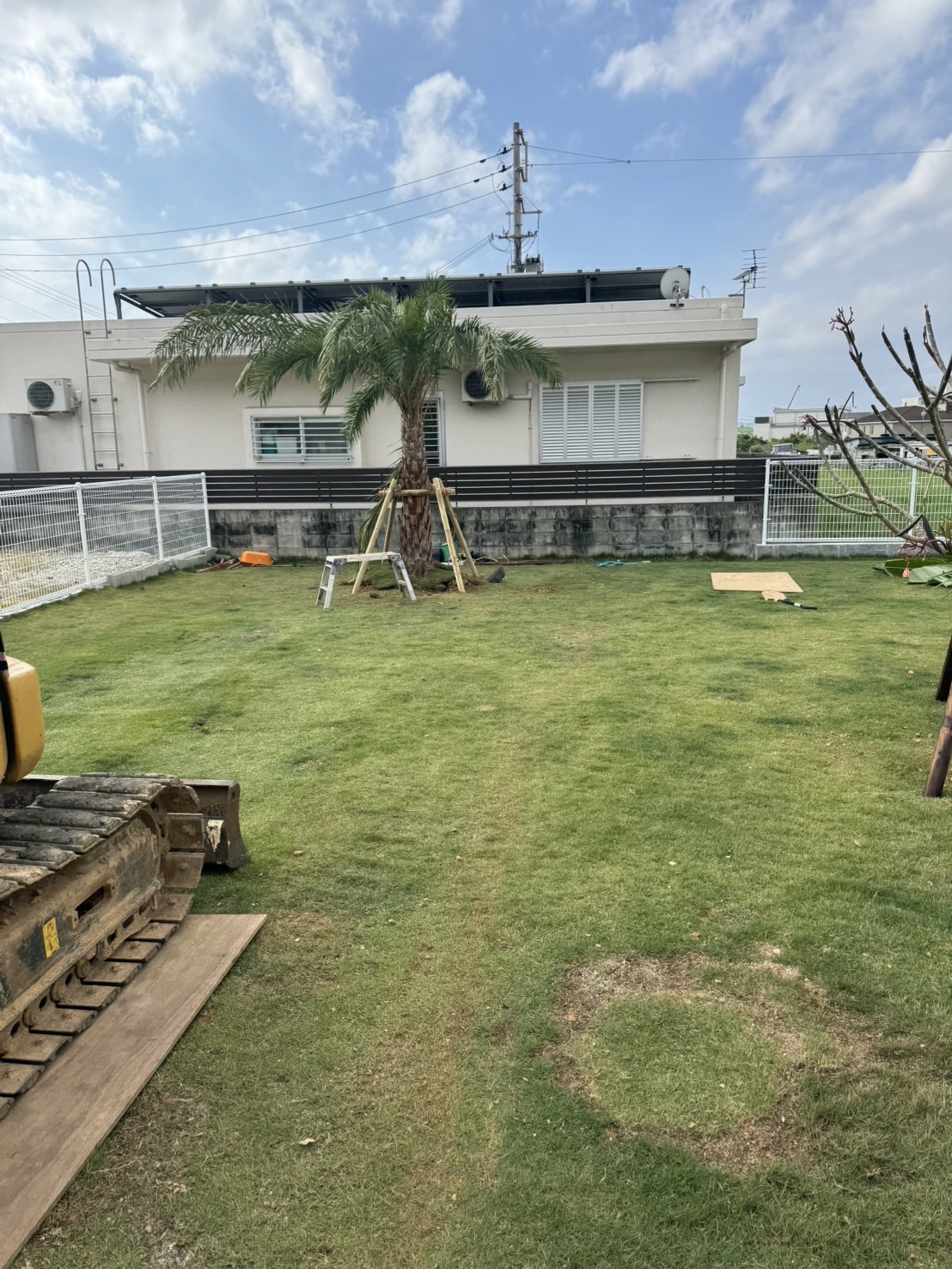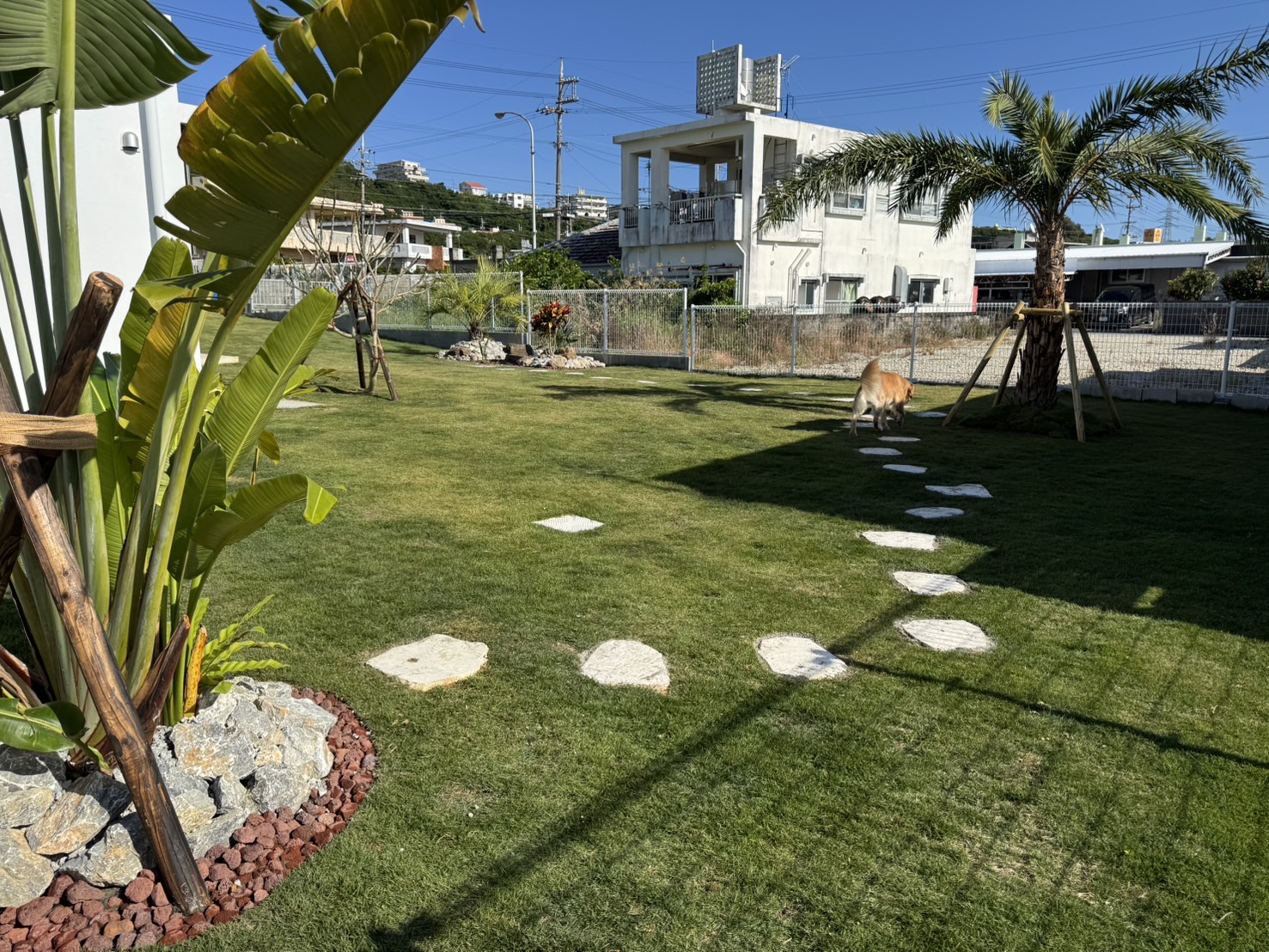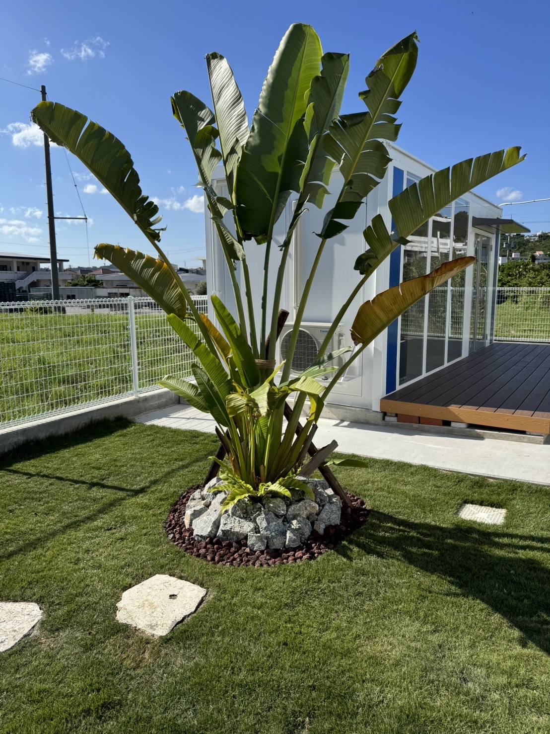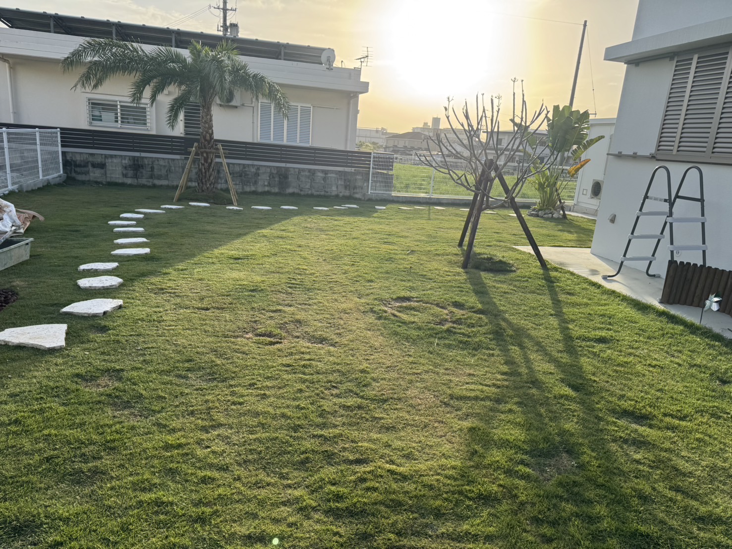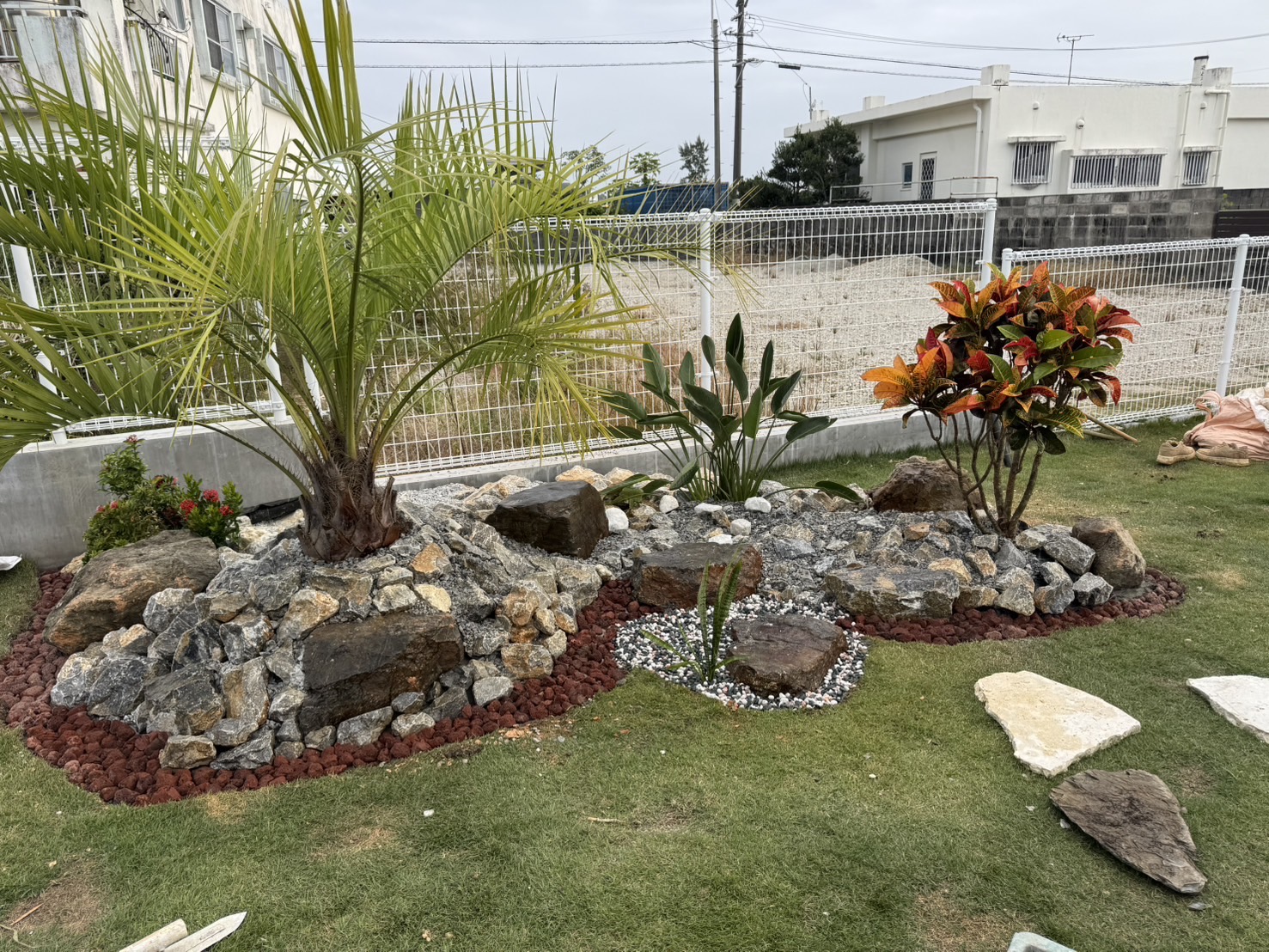 もともと広々とした庭でしたが、お客様がココスヤシ好きということで、ココスヤシを主役にしたドライガーデンへ🌿各ポイントにはナツメヤシとプルメリア、旅人の木を配置し、南国リゾート感を演出✨🌴足元には琉球石灰岩の踏み石を据え、自然な動線と表情をプラス。庭全体の印象がぐっと引き締まり、雰囲気が大きく変わりました😊